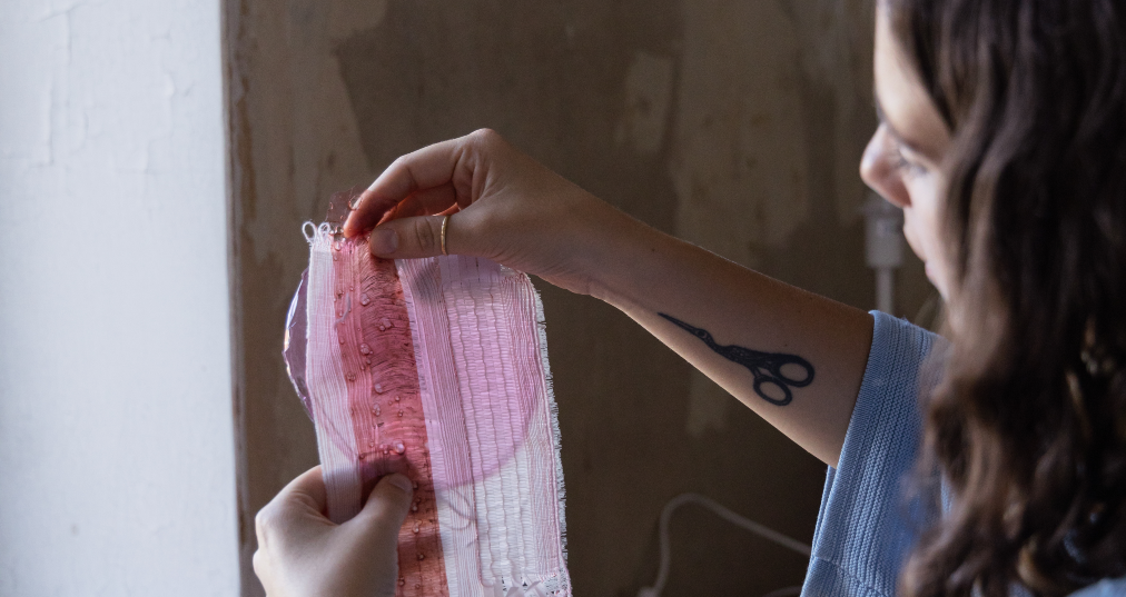 Sofía Guridi, quien reside en Finlandia, es parte del equipo del Bioinnovation Center en Aalto University Finlandia, y desde ese lugar diseñó los lienzos a base de carboximetilcelulosa, donde integró este nuevo formato biomaterial con la técnica tradicional del telar. Estos soportes -dice la autora- nos harán pensar y debatir, demostrando “la capacidad del diseño para contribuir a pensar los materiales desde su potencial y su complejidad, inspirándose en la transformación y degradación de la materia”. El telar fue elegido por ser un elemento identitario y de gran importancia para la cultura material local.