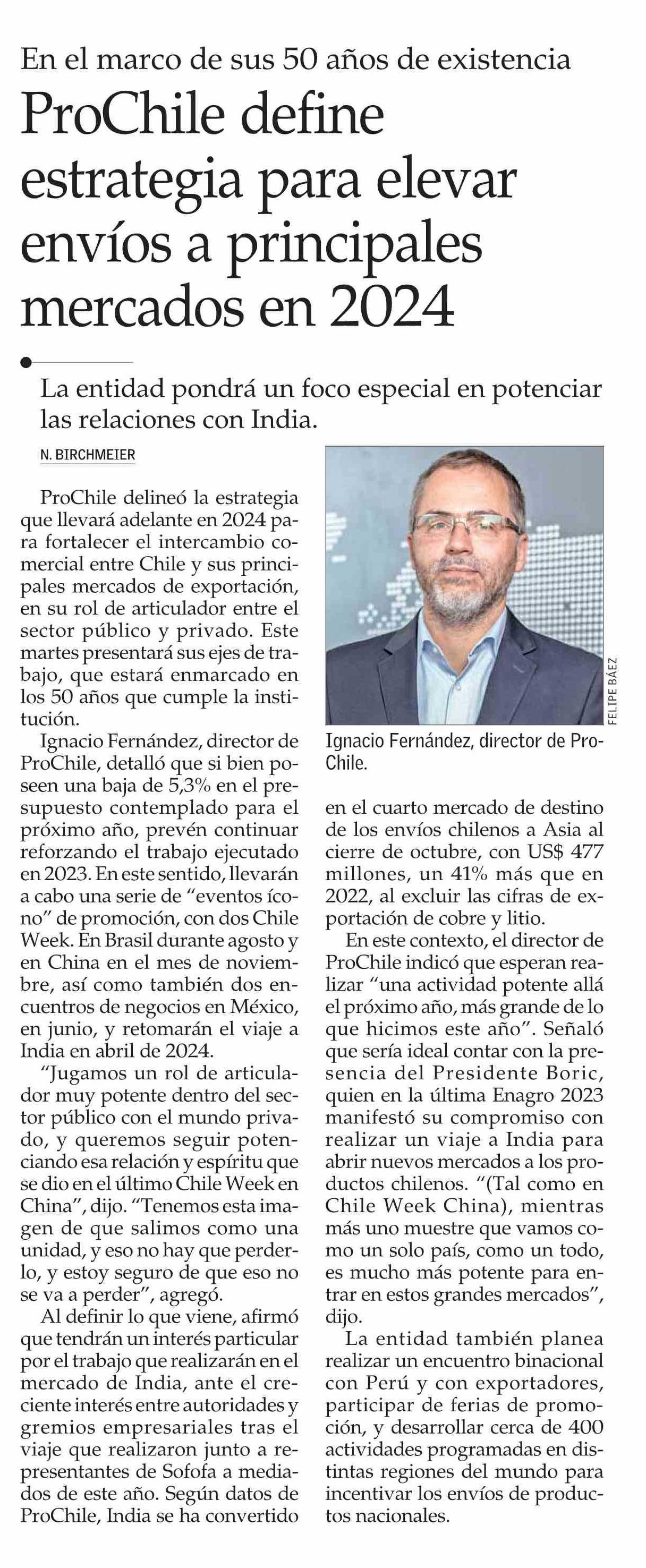 En la nota, publicada este martes 5 de diciembre, se destaca que "ProChile delineó la estrategia que llevará adelante en 2024 para fortalecer el intercambio comercial entre Chile y sus principales mercados de exportación, en su rol de articulador entre el sector público y privado. Este martes presentará sus ejes de trabajo, que estará enmarcado en los 50 años que cumple la institución. Ignacio Fernández, director de ProChile, detalló que si bien poseen una baja de 5,3% en el presupuesto contemplado para el próximo año, prevén continuar reforzando el trabajo ejecutado en 2023. En este sentido, llevarán a cabo una serie de "eventos ícono" de promoción, con dos Chile Week. En Brasil durante agosto y en China en el mes de noviembre, así como también dos encuentros de negocios en México, en junio, y retomarán el viaje a India en abril de 2024".