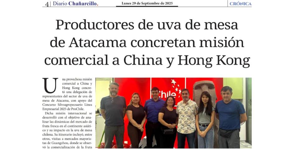 Una nota publicada en Diario Chañarcillo, destaca la provechosa misión comercial a China y Hong Kong concretó una delegación de representantes del sector de uva de mesa de Atacama, con apoyo del Concurso Silvoagropecuario Línea Empresarial 2025 de ProChile. Dicha misión internacional se desarrolló con el objetivo de analizar las dinámicas del mercado de fruta fresca en el continente asiático y su impacto en la uva de mesa chilena.