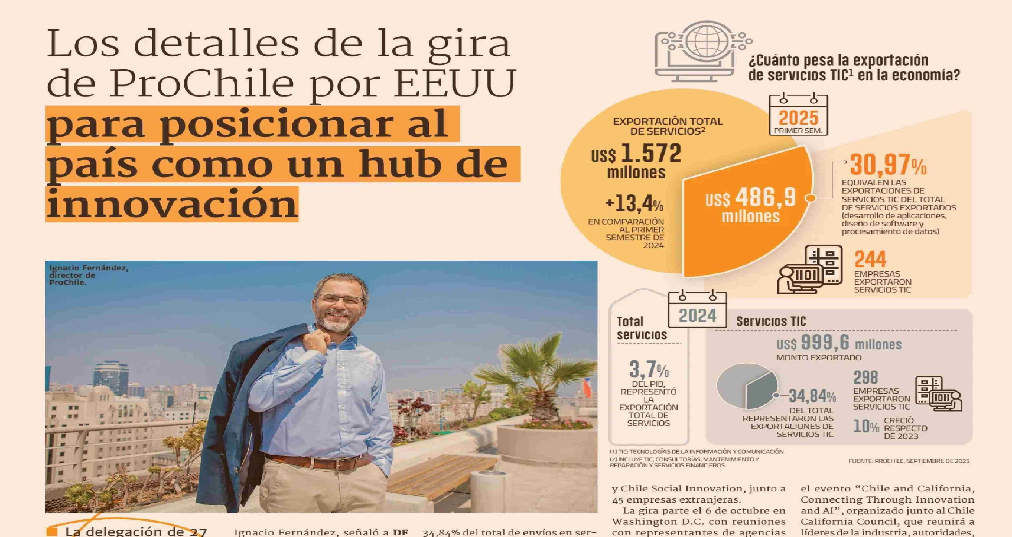 El director general de ProChile, Ignacio Fernández, señaló a DF que la misión se enmarca en el crecimiento de las exportaciones de servicios en 2024, las que representaron el 3,7% del Producto Interno Bruto (PIB), apalancado principalmente por el alza de los servicios TIC (tecnologías de la información y las comunicaciones), como el desarrollo de aplicaciones, diseño de software y procesamiento de datos.