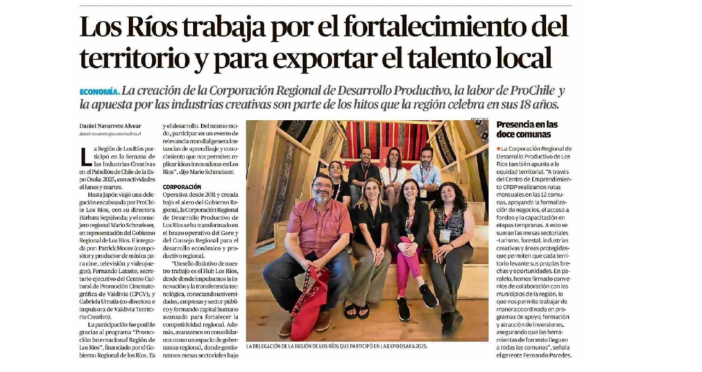 La Región de Los Ríos participó en la Semana de las Industrias Creativas en el Pabellón de Chile de la Expo Osaka 2025, con actividades el lunes y martes. (...) La participación fue posible gracias al programa “Promoción Internacional de la Región de Los Ríos”, financiado por el Gobierno Regional de Los Ríos. Es el ejemplo más reciente de una de las misiones de la región en sus 18 años de historia.
