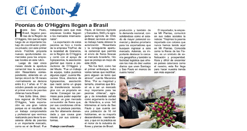 En un artículo publicado en el diario El Cóndor de San Fernando informaron sobre la exportación de peonías a Brasil, y el trabajo de apoyo que realizó ProChile con empresas y gremios regionales en un hito que abre camino para que empresas de este sector generen nuevas relaciones comerciales.