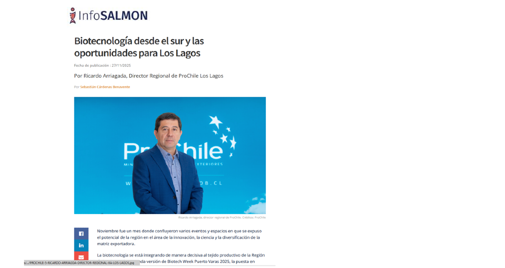 Una columna de opinión del director regional de ProChile Los Lagos, Ricardo Arriagada, fue publicada en el medio Info Salmón, y destaca el trabajo y las oportunidades para el sector de innovación y biotecnología local.