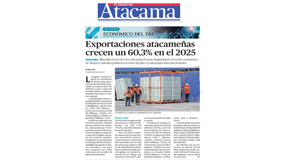 Destacado en Prensa: "Exportaciones Atacameñas crecen 60,3% en el 2025"
