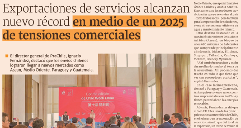 El Diario Financiero entrevistó al Director General de ProChile, Ignacio Fernández, quien hizo un balance de las exportaciones registradas el año 2025, destacando no sólo el nuevo récord en Servicios, sino también la llegada a mercados como ASEAN, Medio Oriente, Paraguay y Guatemala.