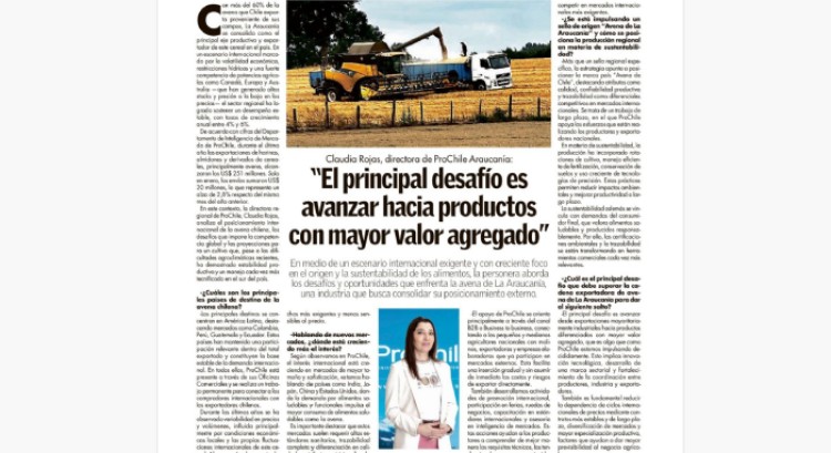 En la revista "Campo Sureño" la directora regional de ProChile en La Araucanía, Claudia Rojas Sanhueza, sostiene que el principal desafío es transitar desde exportaciones mayoritariamente industriales hacia productos diferenciados con mayor valor agregado, capaces de competir no solo en precio, sino también en calidad, trazabilidad y sostenibilidad. Para ello, se impulsa la diversificación de mercados, el fortalecimiento asociativo, la innovación tecnológica y la consolidación de la marca país “Avena de Chile”. Asimismo, se enfatiza la adopción de prácticas sustentables y certificaciones que respondan a consumidores más exigentes. A mediano plazo, la proyección es de un crecimiento moderado pero sostenido, condicionado a la capacidad del sector para diferenciar su oferta y reducir la dependencia de los ciclos internacionales de precios.