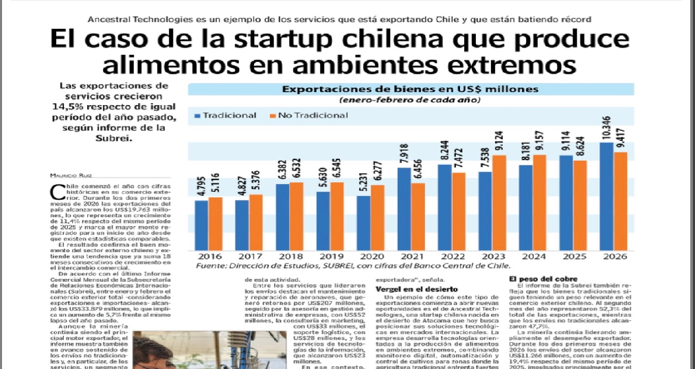 El diario Las Últimas Noticias destacó el sostenido aumento de exportaciones de servicios con un 14,5% respecto de igual período del año pasado y lo ejemplificó con el trabajo que está haciendo la empresa Ancestral Technologies.