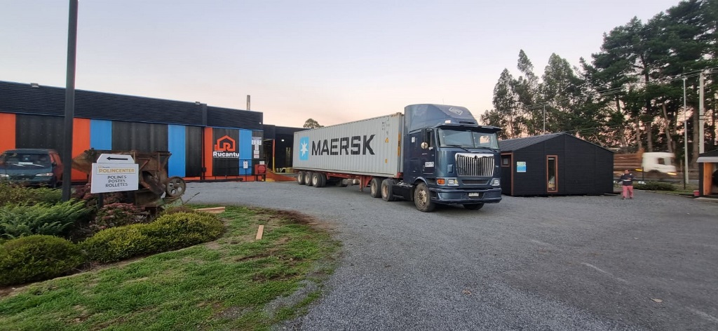 El envío considera dos contenedores High Cube de 40 pies, que trasladan entre el 80% y 85% de la vivienda completamente prefabricada desde la planta ubicada en Padre Las Casas, en la Región de La Araucanía, optimizando tiempos y costos de construcción en destino.