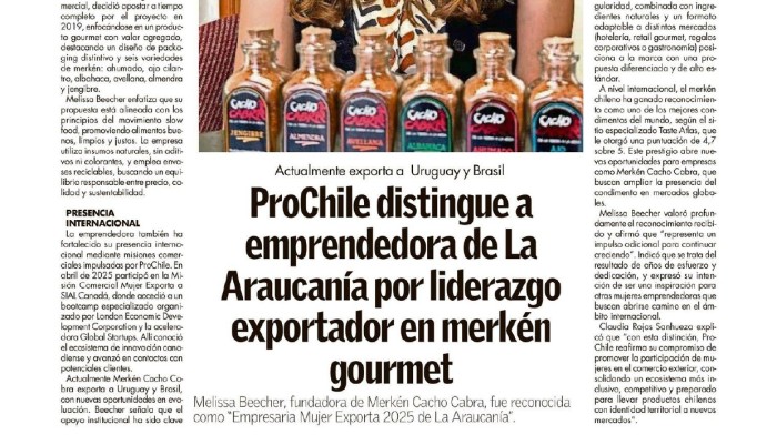 Melissa Beecher con sus productos de merkén "Cacho de Cabra" exporta a Uruguay y Brasil.