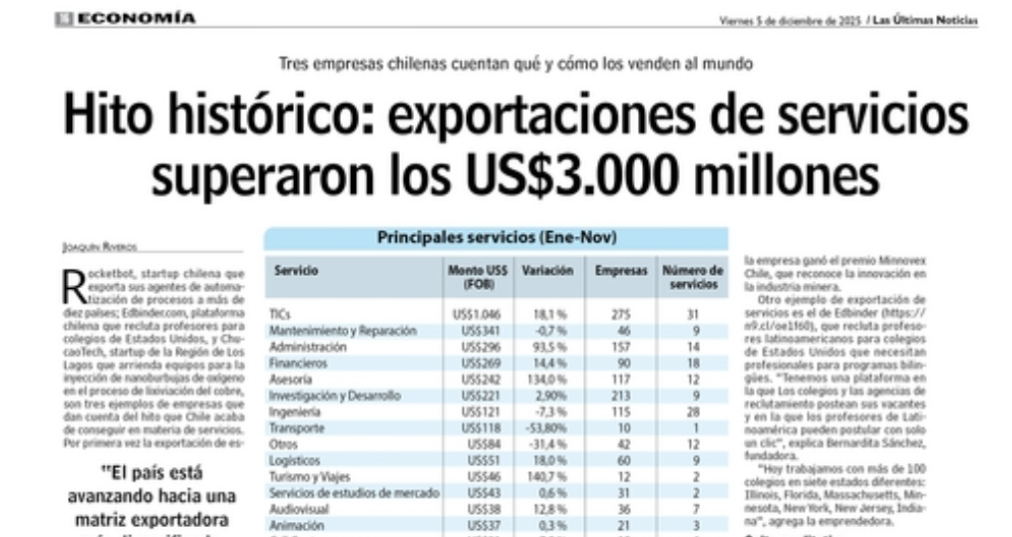 En su edición de este viernes 5 de diciembre, Las Últimas Noticias, destacó el histórico registro de las exportaciones de servicios, superando por primera vez desde que hay estadísticas, la barrera de los US$ 3.000 millones en el período enero-noviembre del año 2025.