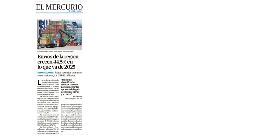 Un artículo publicado en El Mercurio de Valparaíso, destaca el aumento de los envíos de bienes y servicios desde la región, en el periodo enero-octubre de este año.