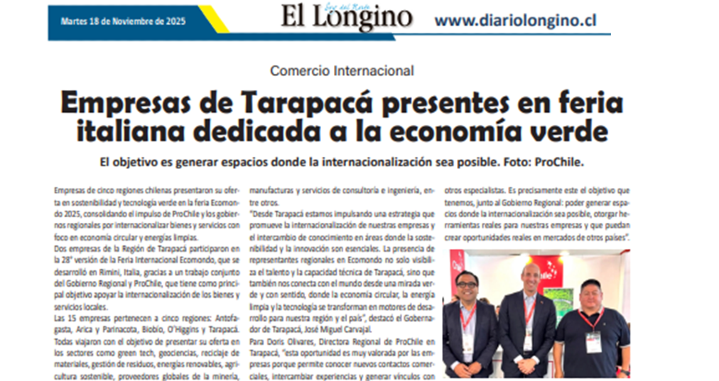 En un artículo del diario El Longino, destacan participación de empresas de Tarapacá en feria italiana, enfocada en economía circular y producción sustentable.