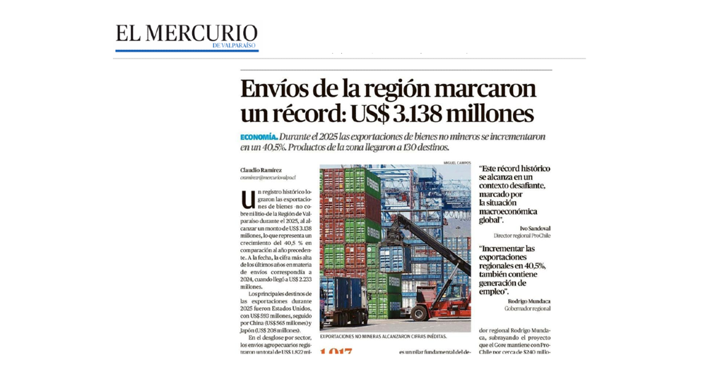 Un artículo de El Mercurio de Valparaíso destaca el récord de envíos desde la región, gracias al trabajo de promoción internacional que desarrolla ProChile con empresas y que también es apoyado por el Gobierno Regional a través de recursos que permiten que la oferta local sea conocida en distintos mercados, gracias al desarrollo de misiones comerciales, participación en ferias especializadas y organización de ruedas de negocios.