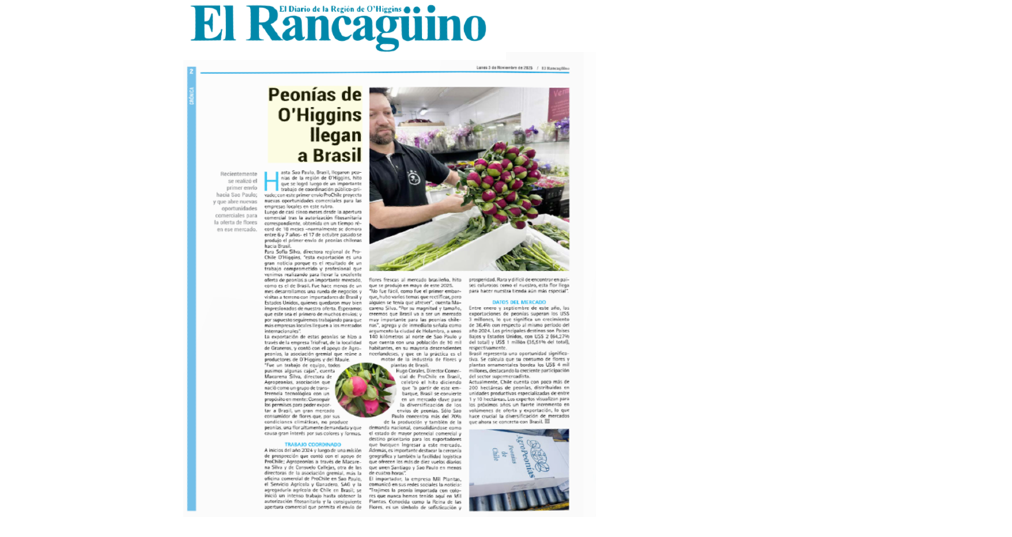 En una nota publicada en el diario El Rancagüino de la Región de O'Higgins se detalla el trabajo realizado por ProChile y gremios locales para lograr la exportación de las primeras peonías al mercado de Brasil.