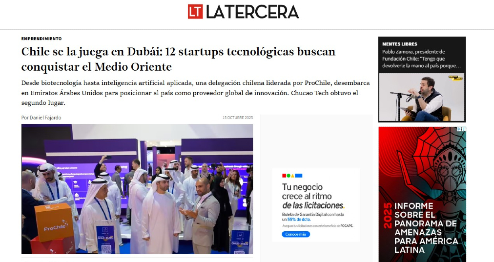 La Tercera destacó a la delegación chilena presente en Innovation Summit Chile-Dubái, donde Chucao Tech obtuvo el segundo lugar en el Supernova Challenge, el pitch internacional de Expand North Star, en Emiratos Árabes Unidos.