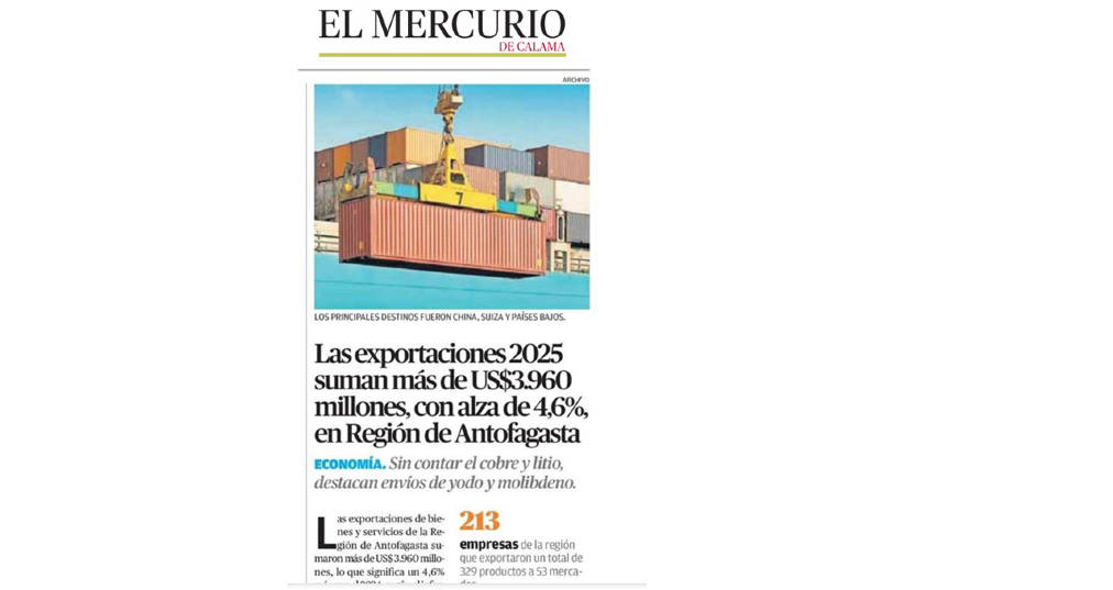 Destacado en Prensa: El Mercurio de Calama "Las exportaciones 2025 suman más de US$ 3.960 millones, con alza de 4,6%, en Región de Antofagasta"